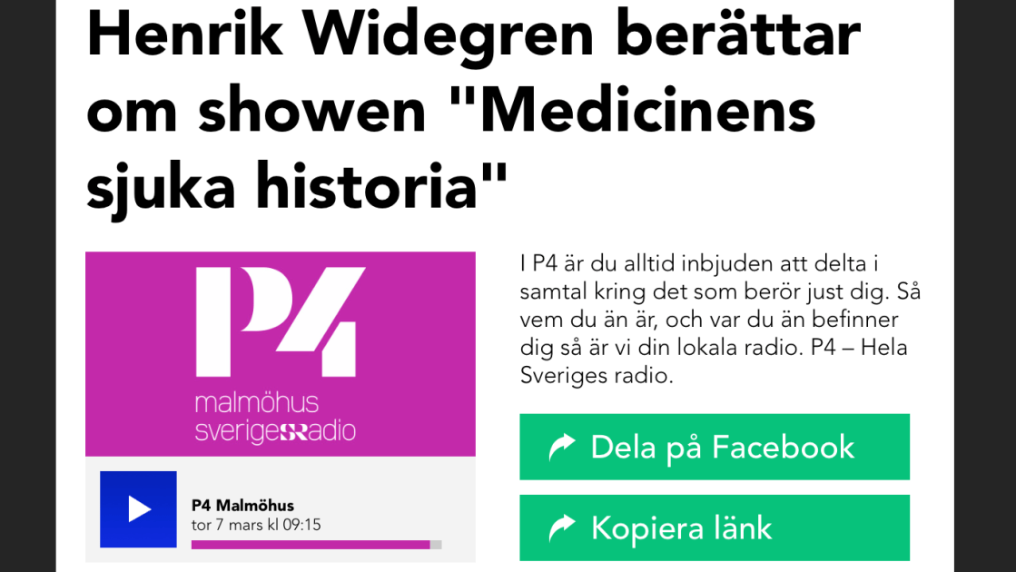 Pratstund i P4 Morgon av henrikwidegren den Mar 08, 2019Mar 08, 2019 Igår hade jag det stora nöjet att prata en stund med Victor och Ola i P4 Morgon. Här kan ni höra. Dela detta: Klicka för att dela på X (Öppnas i ett nytt fönster) X Klicka för att dela på Facebook (Öppnas i ett nytt fönster) Facebook Gilla Laddar in … Inläggsnavigering Föregående: Medicinens sjuka historiaNästa: Ny singel på Spotify!