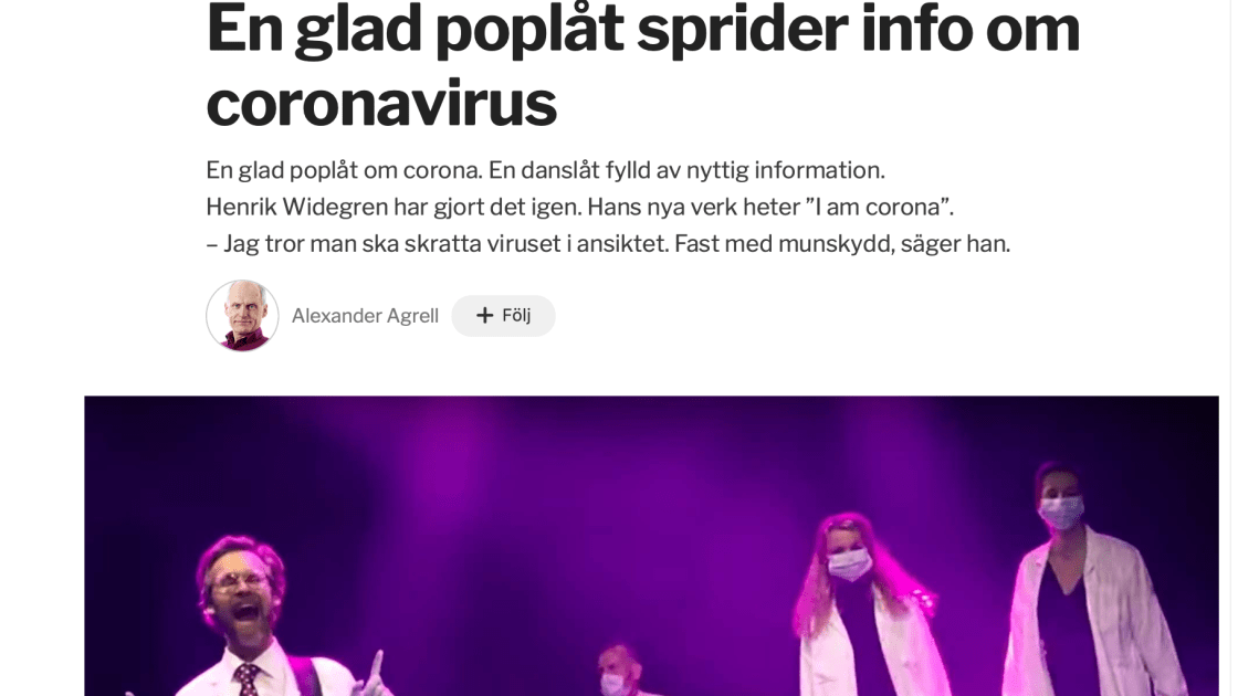 Sydsvenskan writes about I Am Corona av henrikwidegren den Mar 31, 2020Mar 31, 2020 A nice article in Sydsvenskan about I Am Corona! Again: Thank you Markus, Tobias, Pelle, Cecilia, Johan, Christer, Jonas, Anders, Elvira, Hanna and Agnes for a great job! Dela detta: Klicka för att dela på X (Öppnas i ett nytt fönster) X Klicka för att dela på Facebook (Öppnas i ett nytt fönster) Facebook Gilla Laddar in … Inläggsnavigering Föregående: Medicinens sjuka historia fortsätterNästa: Viktiga nyheter