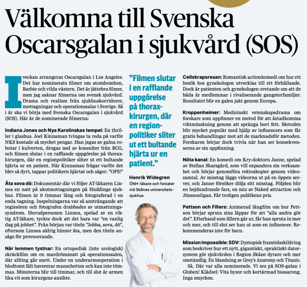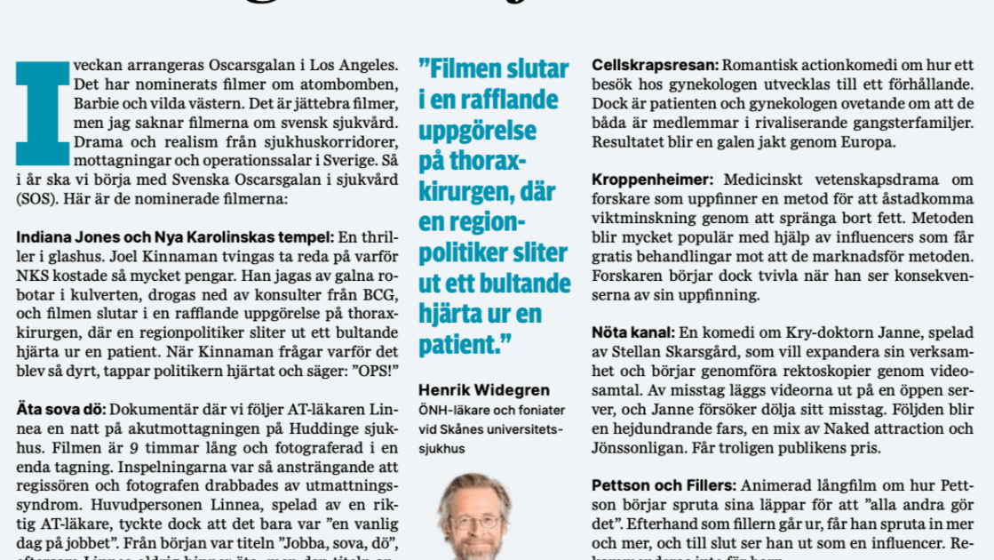 Här kan ni läsa om en helt ny filmgala! Några av de nominerade: Indiana Jones och Nya Karolinskas tempel, Kroppenheimer, Nöta kanal och Cellskrapsresan.