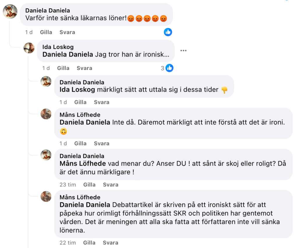 Och om man inte förstår ironi, så kan även det vara roligt! Bifogar även skärmdump från kommentarsfältet på Dagens medicins Fb.