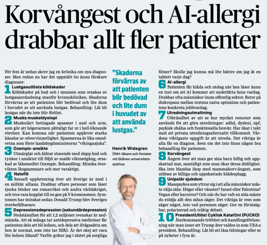 Länk till krönikan i Dagens Medicin: https://www.dagensmedicin.se/opinion/gastkronika/korvangest-och-ai-allergi-drabbar-allt-fler-patienter/