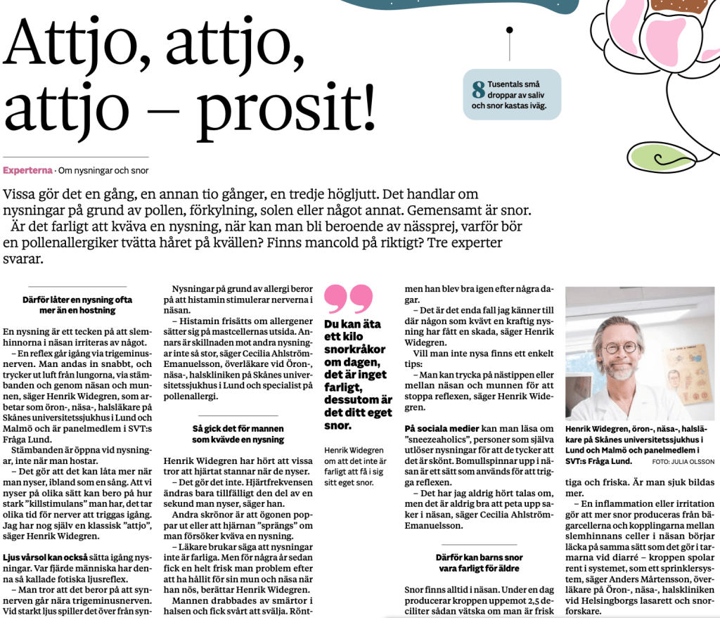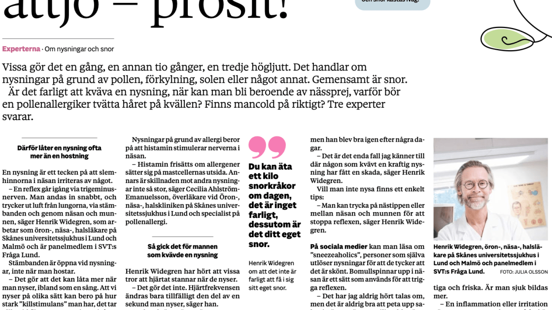 Om du har Sydsvenskan kan du få reda på allt du inte visste att du ville veta om snor och nysningar! Mina kära kollegor Cecilia Ahlström-Emanuelsson och Anders Mårtensson intervjuas också. Här är en länk till artikeln.